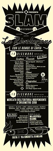 Sabato 18 e domenica 19 dicembre, nel centro sociale Cox 18 nel quartiere Ticinese di Milano avrà luogo la seconda edizione di Slam X. Slam X è il festival di reading e performance organizzato da Agenzia X con la partecipazione di molti scrittori, musicisti e artisti che rappresentano stili, sensibilità e opinioni differenti, ma pronti a salire sul palco per leggere testi, alcuni musicati e altri figurati, che richiamano a un'idea critica della società contemporanea.