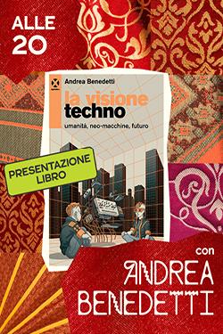 Segue la presentazione del libro La visione techno. Umanità, neo-macchine, futuro, un viaggio fra aneddoti e speculazioni, fatti e teorie di tanti artisti geniali che hanno cercato di cambiare lo status quo musicale, ma anche quello sociale, oltre ogni previsione possibile. A presentarlo l’autore Andrea Benedetti, DJ, produttore, pioniere della scena electro e techno italiana. Sarà lui ad accompagnarci per il resto della serata con un dj set in cui sperimentare dal vivo le svariate sfaccettature della techno underground.