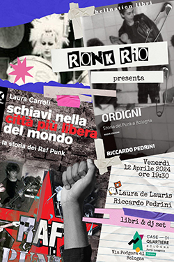 All’interno della XXX festa di Radio Onda d’Urto presso la libreria del Gatto Nero presentazione del libro Schiavi nella città più libera del mondo. La storia dei Raf Punk di Laura Carroli, fondatrice dei Raf Punk e della Attack Punk Records con Marco Philopat.