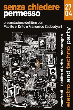Presentazione del nuovo libro di Pablito el Drito Senza chiedere permesso. Flyer e immaginari del rave a seguire live set techno