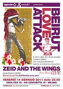 Zeid è uno storico artista promotore dell’underground libanese, dalla guerra civile fino ai giorni nostri. Produttore anche in Egitto e Africa di artisti emergenti, dopo il successo internazionale con i suoi precedenti progetti, Soap Kills e New Goverment. Ora è attivo con Zeid And The Wings, insieme a Marc Codsi, accompagnato dalle tre splendide Wings: Sara, Yasmeen e Jihan